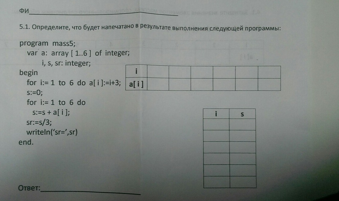 Если исправить ошибку в программе (в описании переменных написать i,s: integer; sr:real;), то на экран будет выведено: