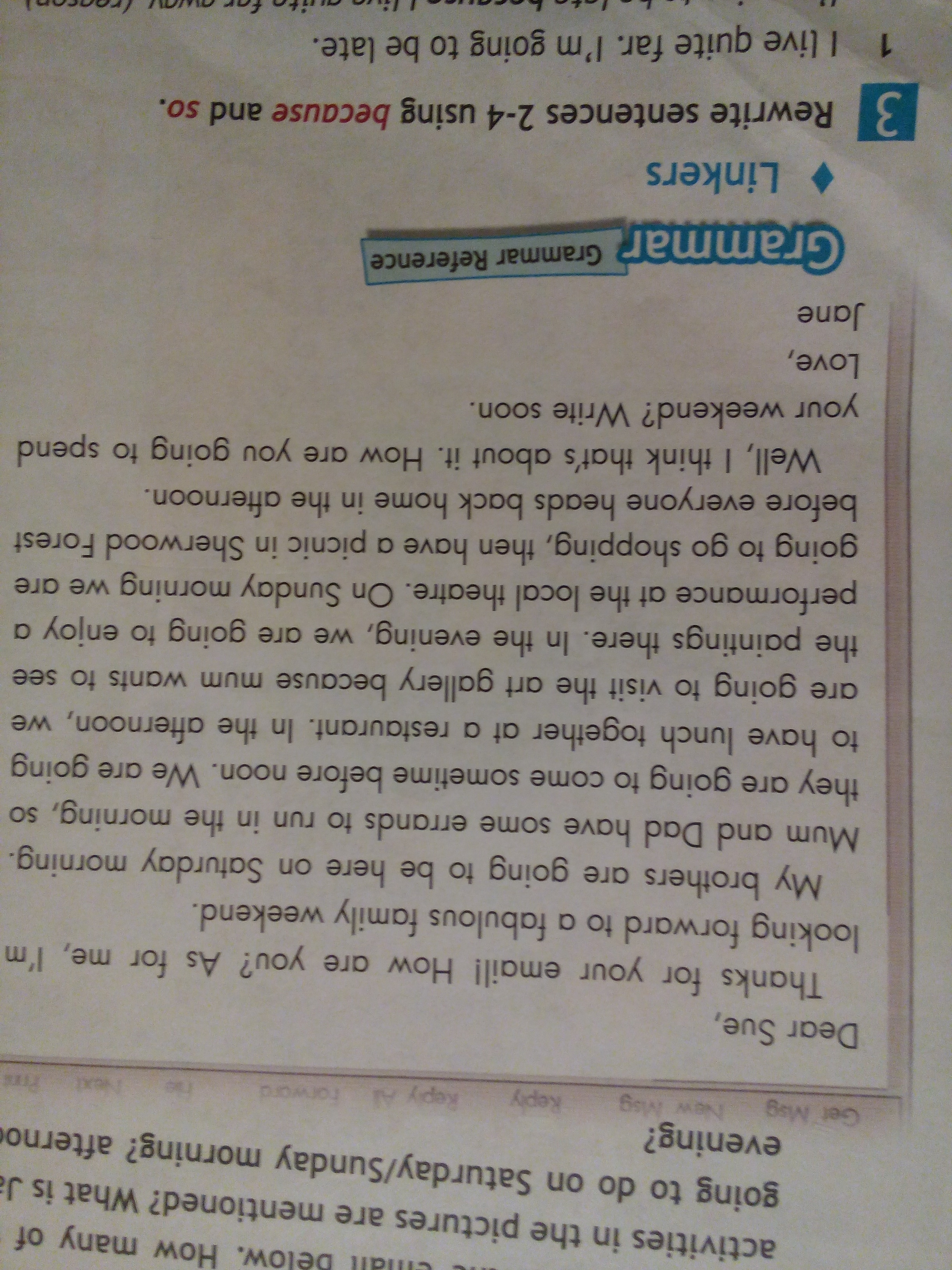 Дорогие Сью! Спасибо за письмо! Как дела? Что касается меня, я с нетерпением жду, чтобы сказочный семейные выходные. Мои братья собираются здесь в субботу утром мама и папа дают некоторые поручения, чтобы быстро делать их утром, поэтому они собираются приехать когда-то до полудня. Мы собираемся пообедать вместе в ресторане. Во второй половине дня, мы собираемся посетить художественную галерею, потому что мама хочет, чтобы увидеть там картины. Вечером мы будем наслаждаться выступлением в местном театре. В воскресенье утром мы будем ходить по магазинам, а затем устроим пикник в Шервудском лесу, прежде чем все направятся обратно домой во второй половине дня Ну, думаю, что это о нем. Как вы собираетесь провести выходные? напиши в ближайшее время. Люблю, Джейн