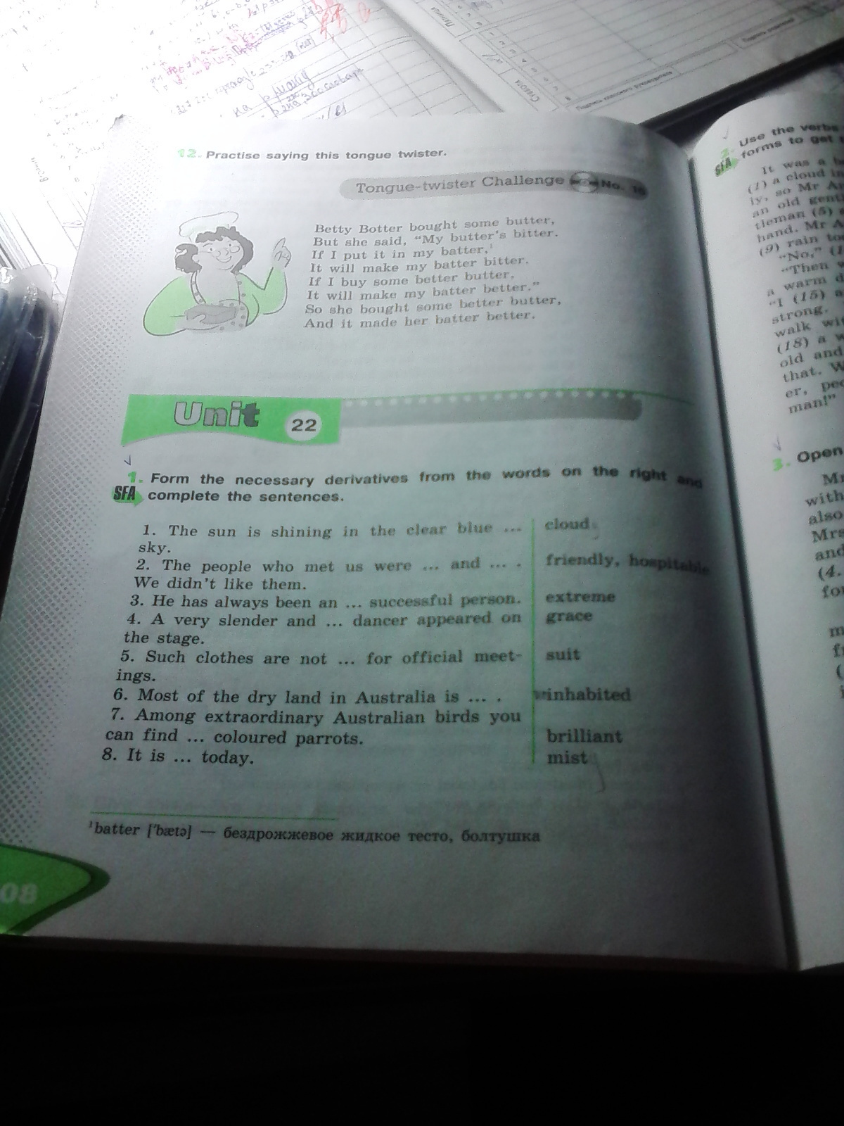 1 cloudy 2 unfriendly and inhospitable 3 extremely 4 graceful 5 suitable 6 uninhabited 7 brilliantly 8 misty
