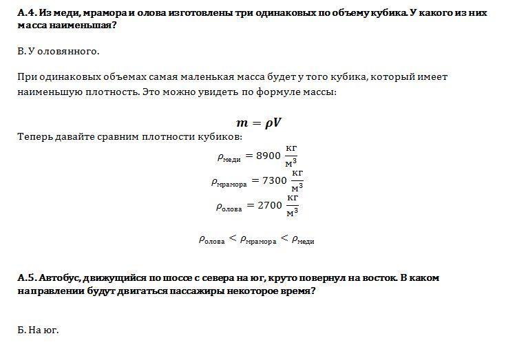 А.4. Из меди, мрамора и олова изготовлены три одинаковых по объему кубика. У какого из них масса наименьшая?