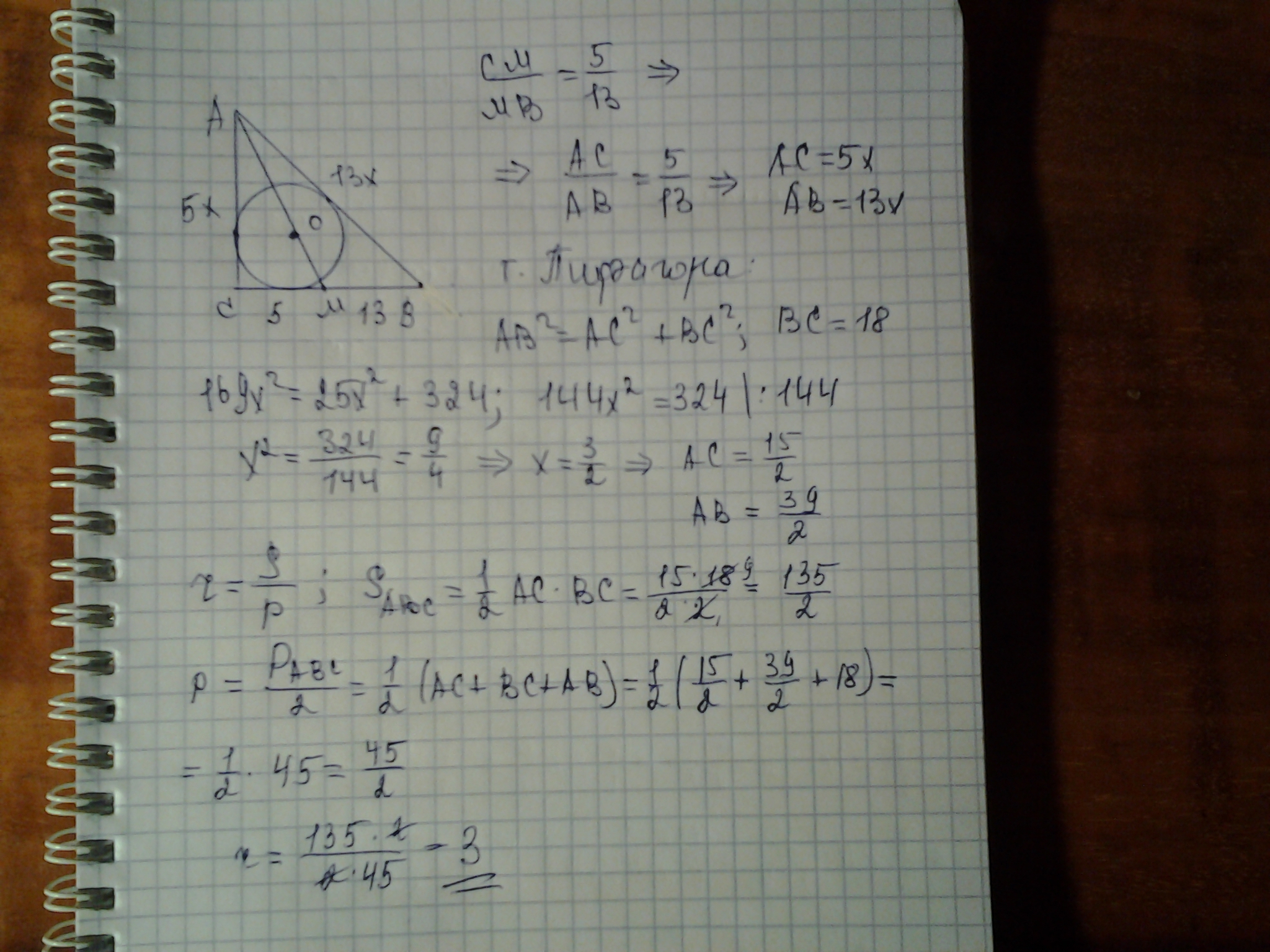 Применена формула радиуса вписанной в треугольник окружности, теорема Пифагора