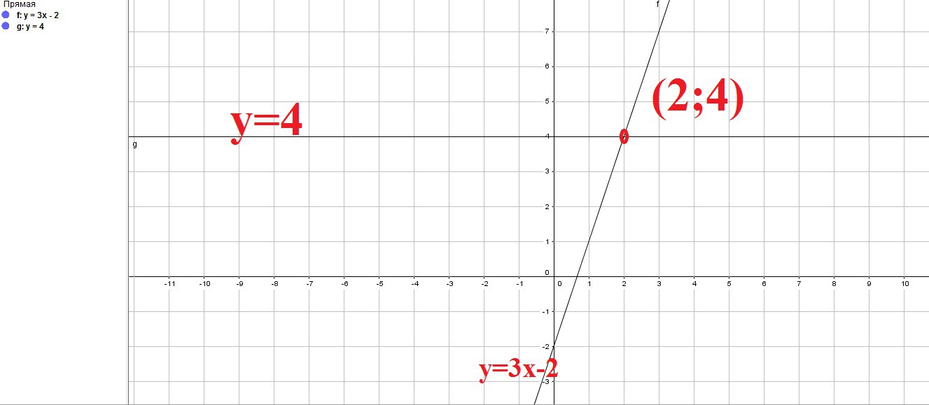 попудуйте в одний системи координат графики функций y=3x-2 та y=4 и знайдить координат точки их перетину
