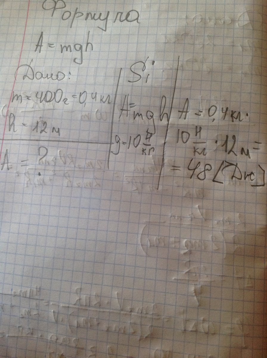 Со скалы упал камень массой 400 г. Какую работу совершила сила тяжести, если высота скалы 12 м,( Пожалуйста решите его с "дано", "СИ"(если можно перевести), формулой(A=F*s, N=A/t,Fупр=Fтяж=mg))_