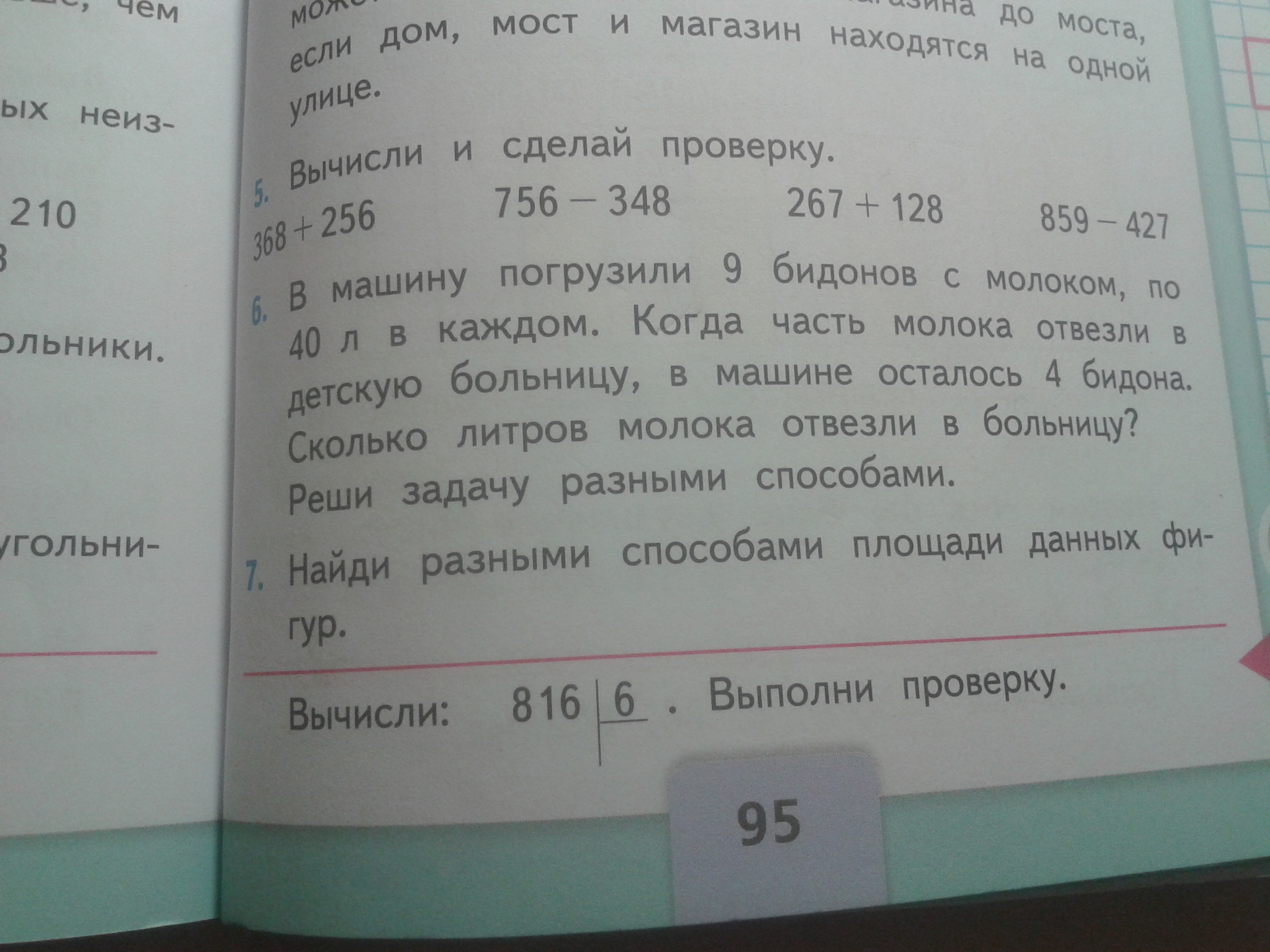 в машину погрузили 9 бидонов с молока отвезли в детскую больницу в машине осталось 4 бидона. сколько литров молока отвезли в больницу ? реши задачу разными способами
