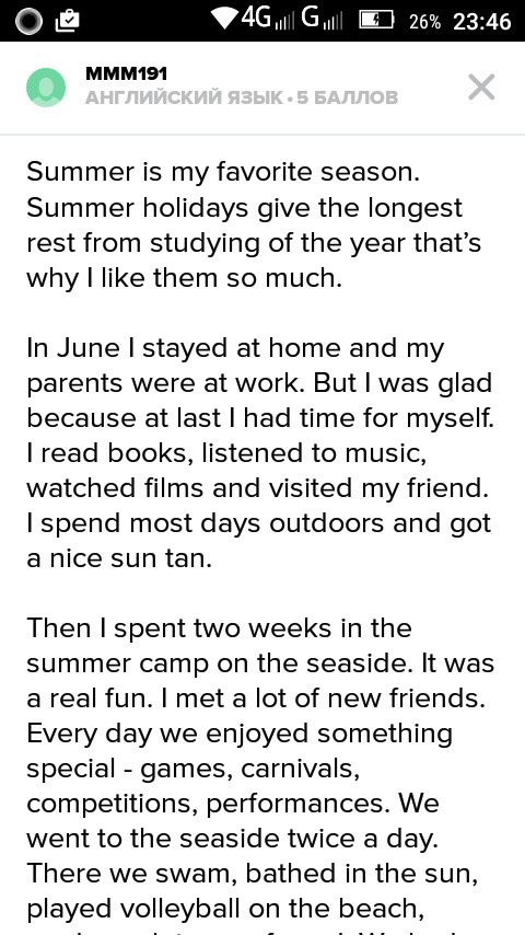 Но этим летом я не только развлекался. Я прошел через выпускные экзамены в школе и вступительные экзамены в университете. Так что большую часть летних каникул я провел за книгами. Конечно, это было не очень интересно, но я рад, что я прошел через это, потому что теперь я - студент лучшего университета нашей страны.