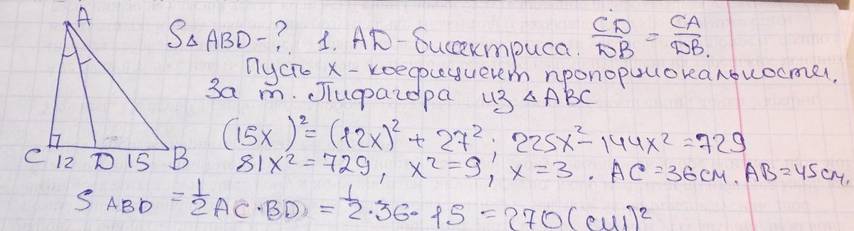 ABC с прямым углом C биссектриса AD делит BC на отрезки BD=15см и DC=12 см. Найдите площадь треугольника AB D.