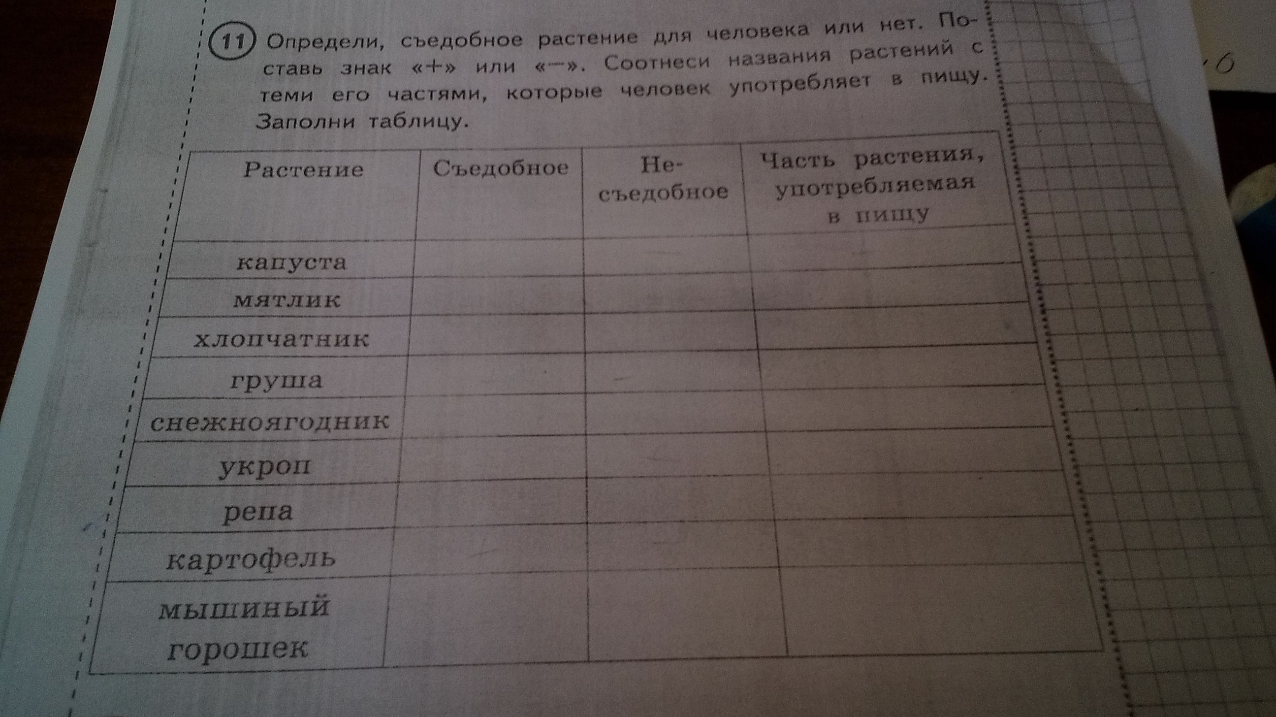 определить съедобные растения для человека или нет поставить знак плюс или минус отметьте названия растений с теми и вычитаем который человек употребляет в пищу заполни таблицу
