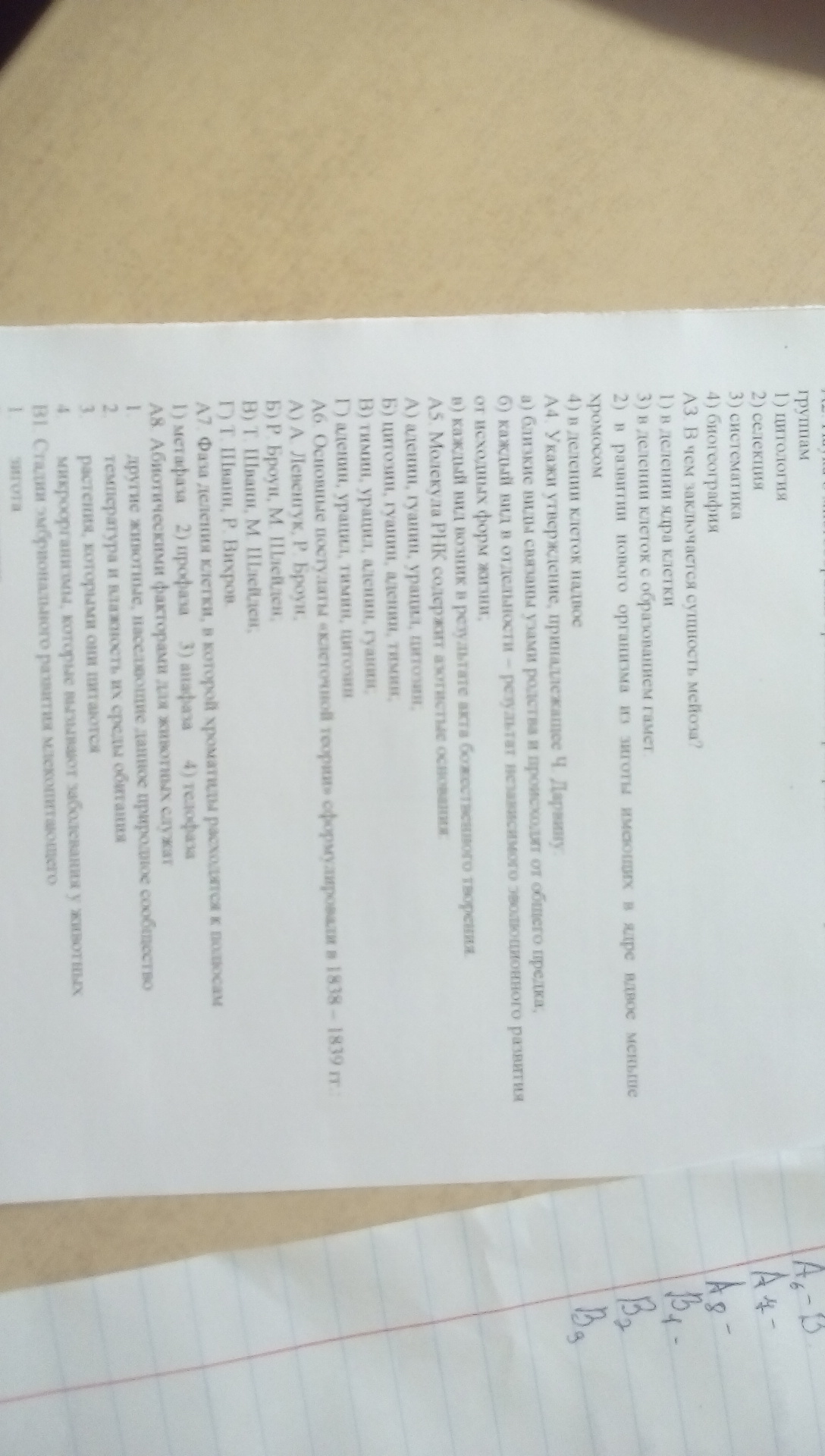 Итоговая контрольная работа по биологии в 9 классе.2 вариант1.Вставь слова:1) Раздел биологии, изучающий строение клетки, ее органоиды и их функции - ………2) Клеточная структура, содержащая генетический материал в форме ДНК -……..3) Процесс поступления в клетку твердых частиц - ……..4) Двумембранные органоиды клетки, запасающие энергию АТФ - ……..5) Организмы, питающиеся готовыми органическими веществами - …….6) Процесс образования новых видов в природе - ……..7) Организмы, важнейшие участники круговорота веществ в экосистеме -……..8) Крупные наиболее существенные изменения, повышающие уровень организации - ………..9) Сообщество живых организмов с физической средой обитания, объединенные обменом веществ и энергии - ……10) Движущие силы эволюции – 1)……2)…….3)………2. Выбрать один верный ответ:1.Второй закон Г. Менделя называется законом:1) расщепления 2) единообразия 3) сцепленного наследования4)независимого наследования2. В процессе энергетического обменав клетке идет1) образование органических веществ 2) расходование АТФ3) синтез неорганических веществ 4) расщепление органических веществ3.Мономером крахмала является1) жирная кислота 2) глицерин 3) глюкоза 4) аминокислота4. Хлоропласты в растительной клетке1) выполняют защитную функцию 2) осуществляют связь между частями клетки3) обеспечивают накопление воды 4) осуществляют синтез органических веществ из неорганических5. Фаза митоза, в которой происходит спирализация хромосом это1) телофаза 2) метафаза 3) профаза 4) анафаза6. Девочки, родившиеся от отца-дальтоника и здоровой ( не носительницы) матери, будут нести ген дальтонизма с вероятностью:1) 25% 2) 75% 3) 50% 4) 100%7.Если генотипы гибридов дали расщепление 1:2:1,то генотипы родителей :1)АА ха а 2) АА х Аа 3) Аа х аа 4) Аа х Аа8. Кодон АГЦ и-РНК соответствует в т-РНК антикодону:1) ТЦГ 2) УЦГ 3) ТЦГ 4) АЦГ9. Сколько типов гамет образует дигетерозигота?1) 8 2) 6 3) 4 4) 210.Индивидуальное развитие любого организма от момента оплодотворения до завершения жизнедеятельности - это1.филогенез 2)онтогенез 3)партеногенез 4)эмбриогенез3. Соотнеси особенности процессов биосинтеза белка и фотосинтезаОсобенности процессаПроцессы1.Завершается образованием углеводов2.Исходные вещества- аминокислоты3.В основе лежат реакции матричного синтеза4.Исходные вещества – углекислый газ и вода5.АТФ синтезируется в ходе процесса6.АТФ используется для протекания процессаА) Биосинтез белкаБ) Фотосинтез1234564. Чем естественный отбор отличается от искусственного?Итоговая контрольная работа по биологии в 9 классе.1 вариант1.Вставь слова:1) Наука, изучающая закономерности наследственности и изменчивости - …….2) Гетеротрофные организмы, потребители первичной продукции -………3) Наименьшая таксономическая единица в систематике - ……..4) Совокупность организмов, занимающих определенную территорию и в какой-то степени изолированную от других особей того же вида - ……….5) Автотрофные организмы, составляющие первое звено пищевой цепи - ………….6) Синтез белка происходит на ……….7) Стопки мембранных полостей в которых упаковываются синтезированные вещества в клетке -………8) Избирательное выживание и преимущественное размножение наиболее приспособленных особей -……….9) Упрощение организации, утрата ряда систем органов - ……….10) Деление, при котором образуется две равноценные дочерние клетки -…………2. Выбрать один верн