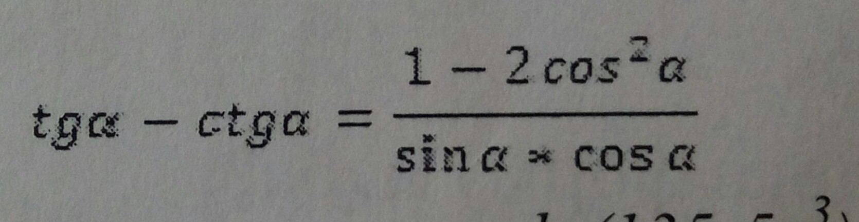 Рассмотрим левую часть tgx-ctgx=Sinx/Cosx - Cosx/Sinx. Приводим к общему знаменателю, получаем (Sin²x-Cos²x)/(Sinx*Cosx)