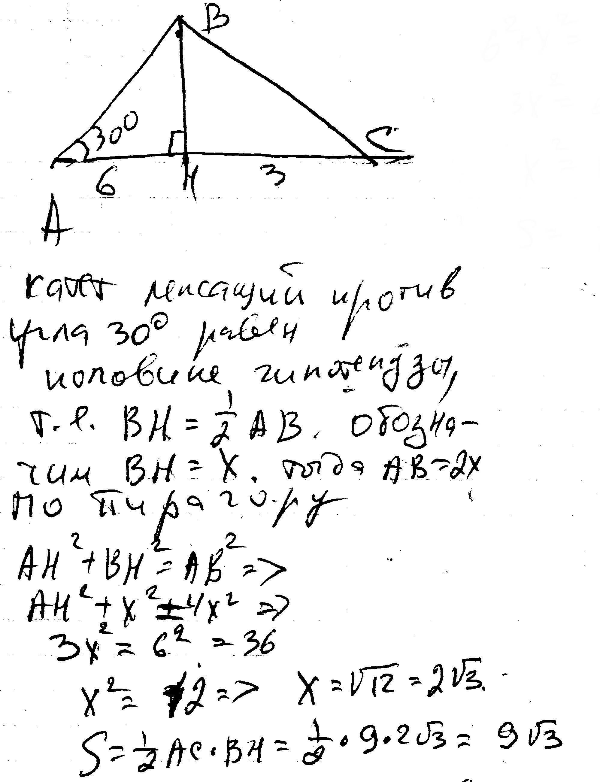 Используя данные, указанные на рисунке, найдите площадь треугольника ABC.