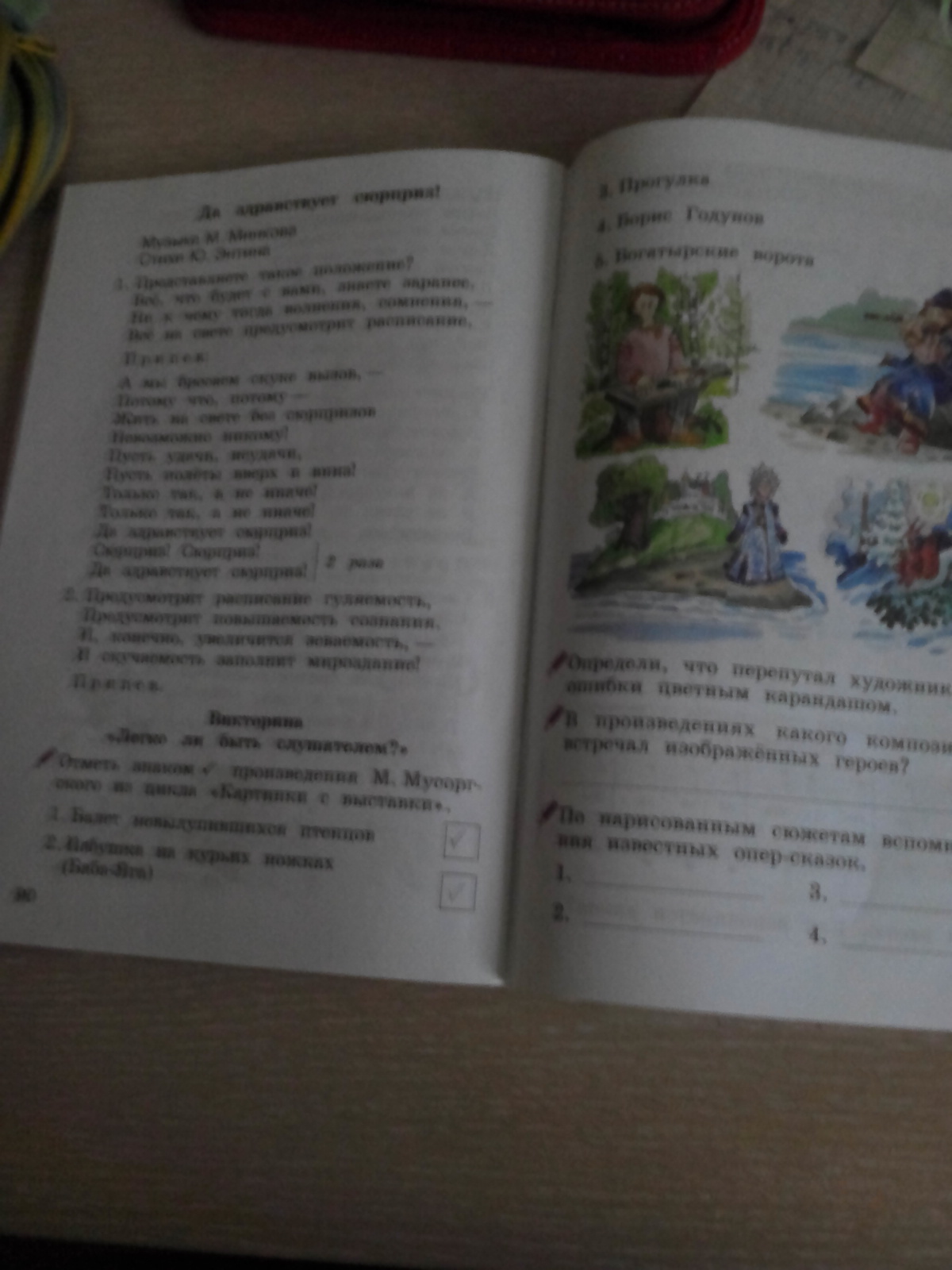 викторина Легко ли быть слушателем Отметь знаком произведения Мусоргского из цикла картинки с выставки балет невылупившихся птенцов 1 Избушка на курьих ножках 2 прогулка 3 Борис Годунов 4 Богатырские ворота 5