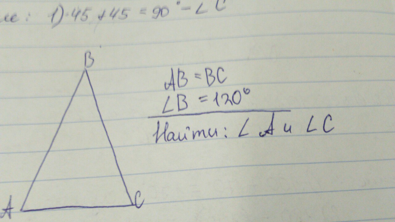 уголА=углуС=(180°-120°):2=60°:2=30°