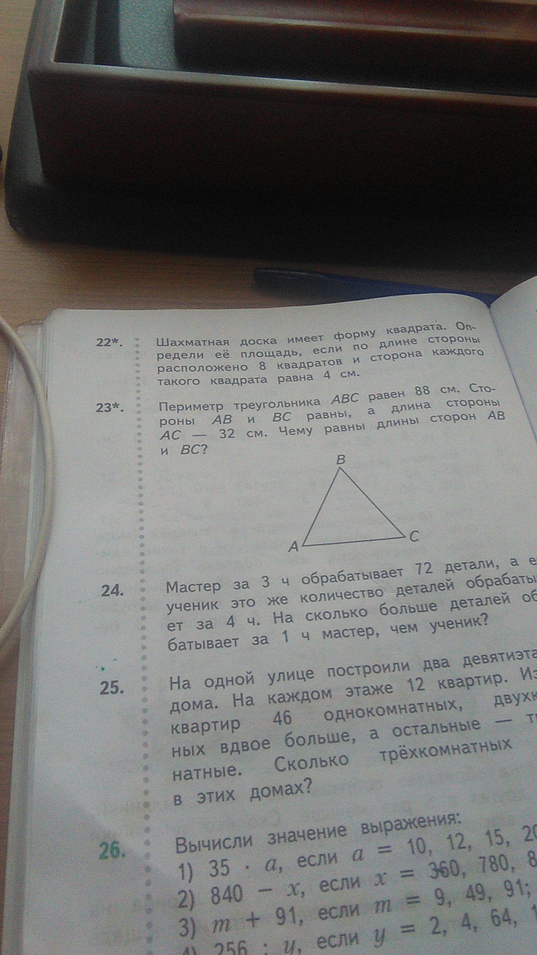 1) 4*4=16 (см в кв)-площадь маленького квадрата; 2) 8*8=64(шт)- всего квадратов; 3) 64*16=1024(см в кв)- площадь доски