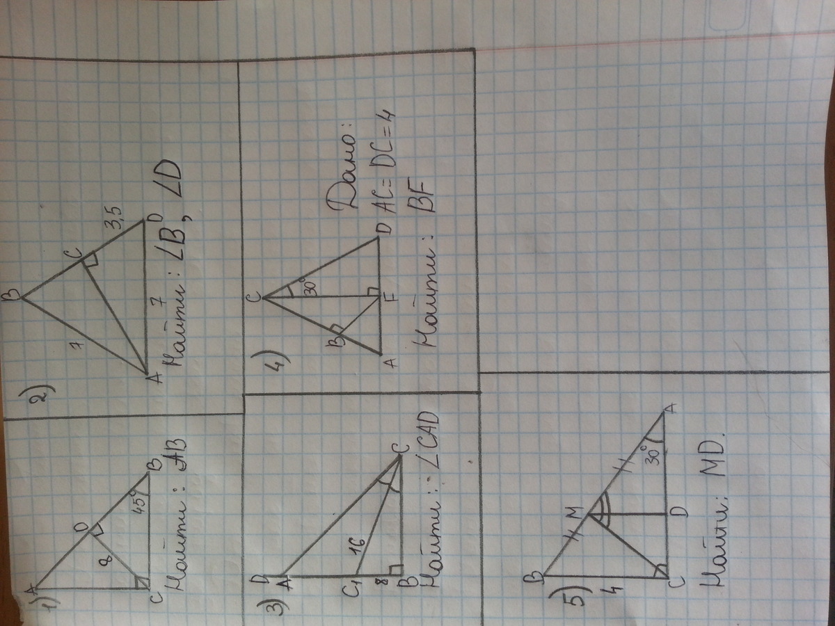 5)в прямоугольном треугольнике АВС катет ВС лежит против угла 30градусов, поэтому ВС=АВ:2, тогда АВ=2*ВС=2*4=8, угол В=90градусов -30градусов=60градусов. М-середина АВ, ВМ=АМ=8:2=4, медиана проведённая из прямого угла равна половине гипотенузы, СМ=АВ:2=4, треугольник СВМ-равнобедренный, с углом 60градусов, значит он равносторонний, СМ=4, МД-биссектрисазначит является высотой и лежит против угла 30 градусов, поэтому СМ=АМ:2=4:2=2