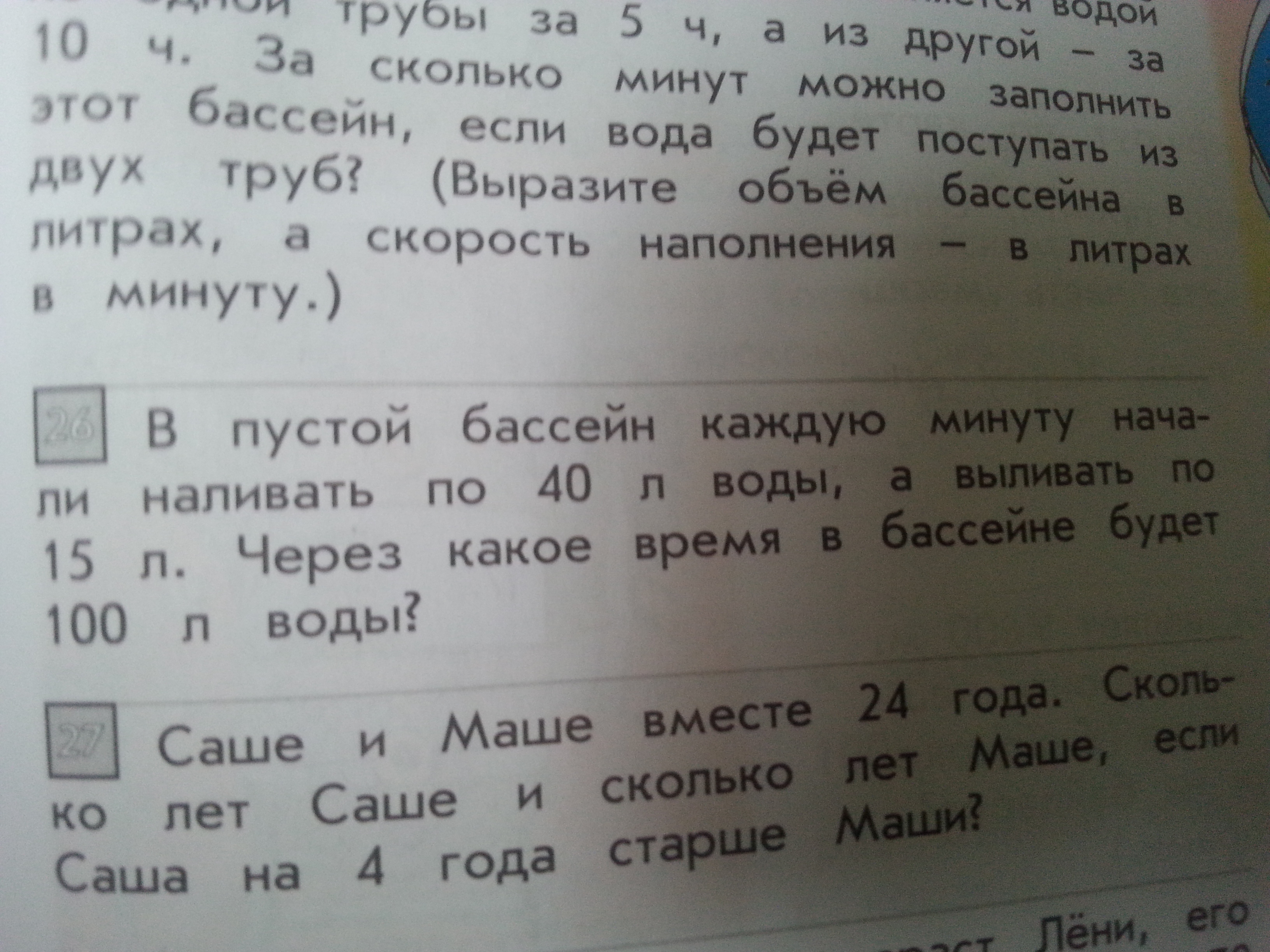 Ответ: через 4 минуты в бассейне будет 100 литров воды .