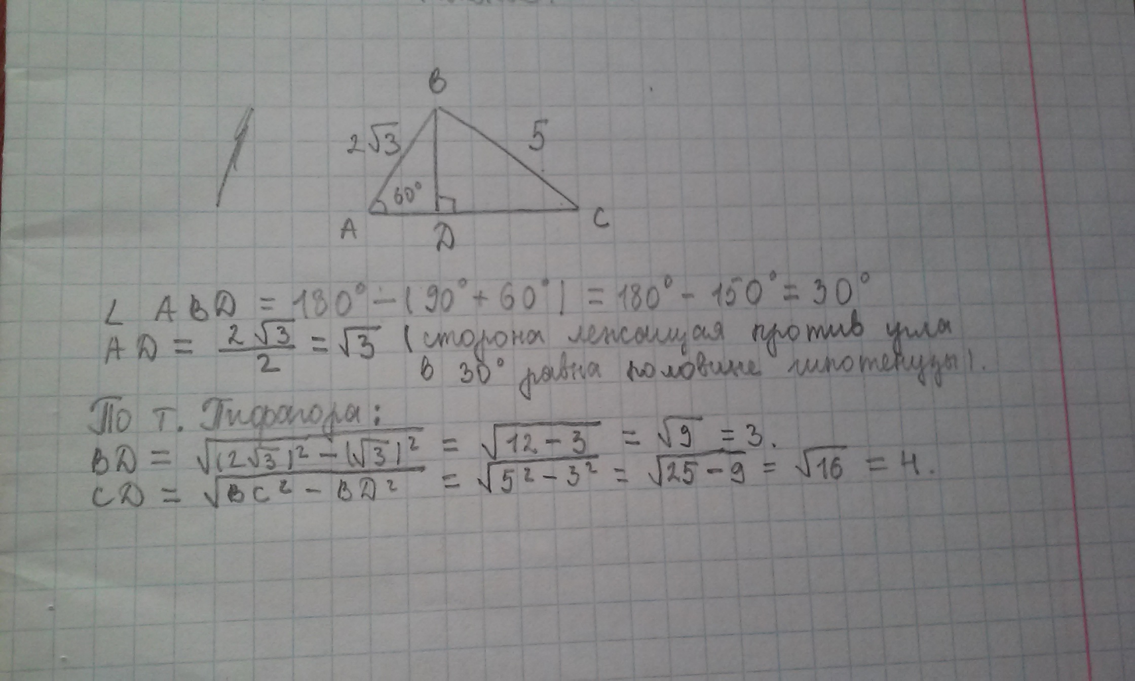 1) Высота BD, ▲ABC делит его на стороны AC на отрезки AD и CD. Найти отрезок CD, если AB=2√3, BC=5 см., ∠А=60°.