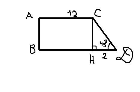 Нам нужно найти высоту h. Находим из прямоугольного треугольника, который образован прямоугольным треугольником CHD. Второй угол тоже равен 45 градусам. Так как в треугольнике 180 градусов. Один угол прямой, второй равен 45 градусам. Значит 180-90-45=45 градусов. Треугольник CHD - равнобедренный. Значит CH=HD. CH=BD-AC=14-12=2. Высота равна CH=2.