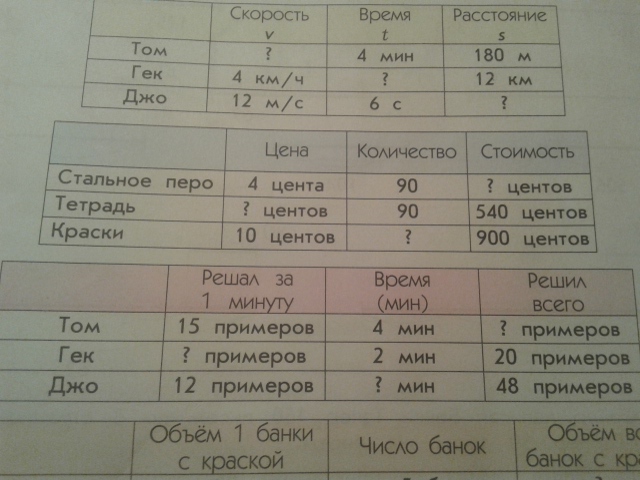 Том,Гек и Джо соревновались.Том за 4 минуты пробежал 180 м.Гек бежал со скоростью 4 км/ч и пробежал 12 км,а у Джо скорость 12м/с и он бежал 6 с.Какая скорость у Тома?Сколько бежал Гек? Сколько пробежал Джо?