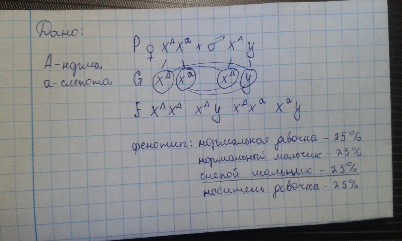 Допоможіть будь ласка!!! У людини кольорова сліпота зумовлена рецесивним геном, що знаходиться в Х - хромосомі. Жінка з нормальним зором, батько якої страждав кольоровою сліпотою, одружилася з чоловіком, який мав нормальний зір. Встановіть вірогідність (у %) народження в них дитини з кольоровою сліпотою.