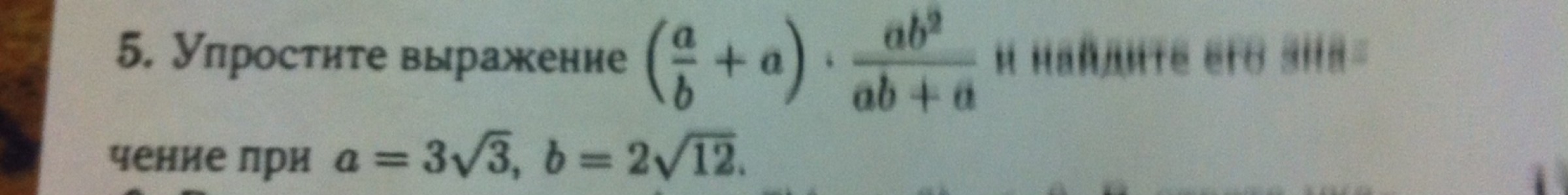 Первое действие в скобке: домножаешь a на b и выходит a+ab/b. Вторым действием: (ab+a)*ab^2/b*(ab+a). В результате сокращений выходит: ab. Ну а дальше просто подставляешь значения и выходит: 6*6=36