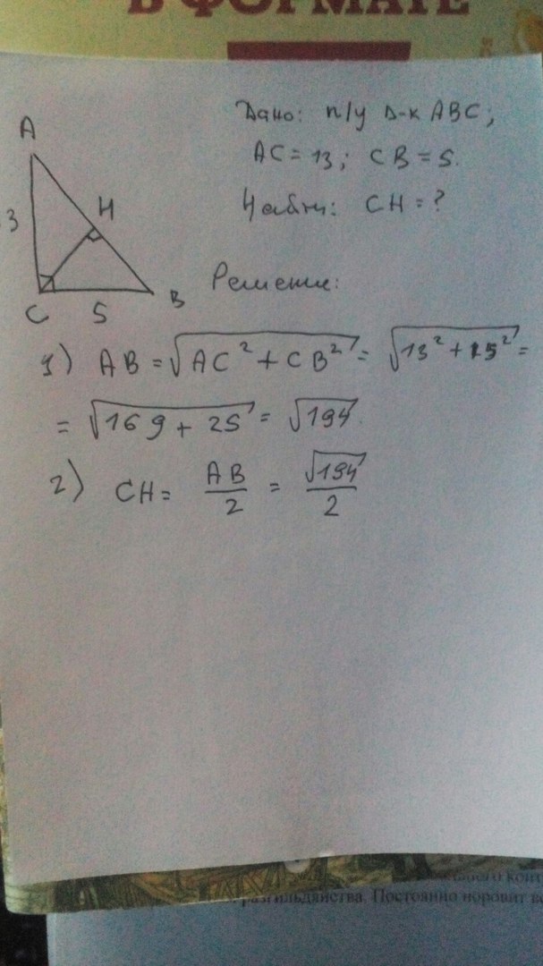 В прямоугольном треугольнике катеты равны 13 см и 5 см. Найти высоту опущенную на гипотенузу ПОМОГИТЕ ПОЖАЛУЙСТА ДАНО РЕШЕНИЕ РИСУНОК