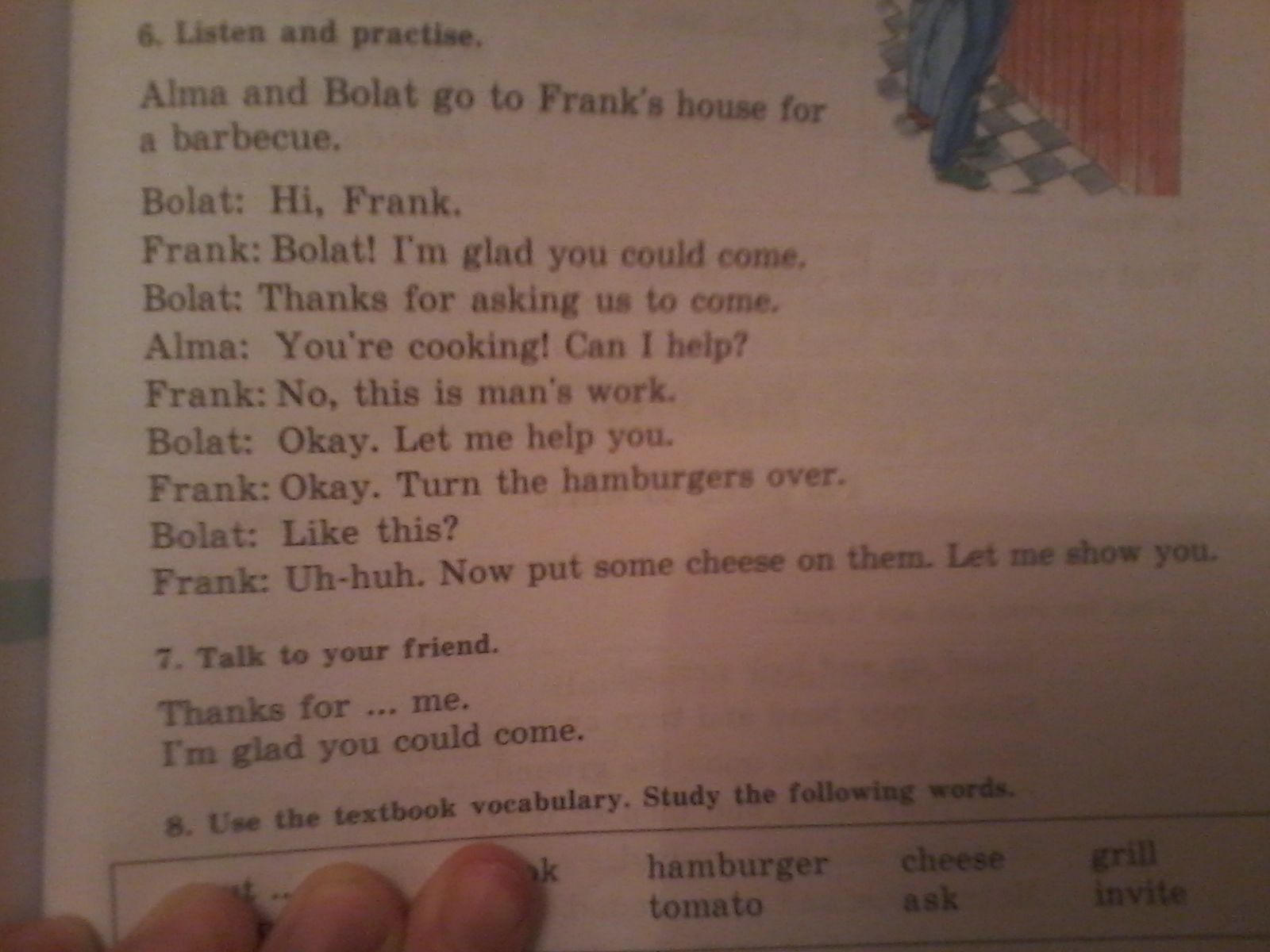 Болат: Привет Фрэнк!.Франк: Болат Я рад, что ты пришел.Болат: Спасибо за вопрос, чтобы мы приехали.Энн: Вы готовить! Я могу помочь?Франк: Нет, это мужская работа.Болат: Хорошо. Позвольте мне помочь вам.Франк: Хорошо. Включите гамбургеры над.Болат: Как это?Франк: Угу. Теперь положите сыр на них. Позволь мне показать тебе.