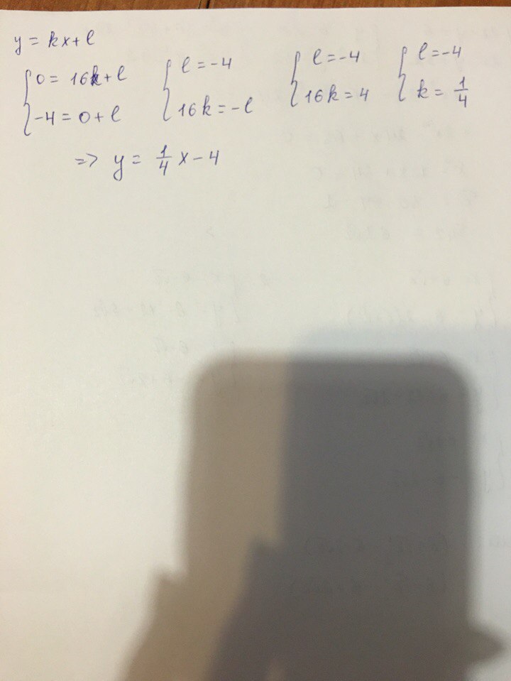 Прямая y=kx+l пересекает ось х в точке (16;0), а ось у- в точке (0; -4). Запишите уравнение этой прямой.