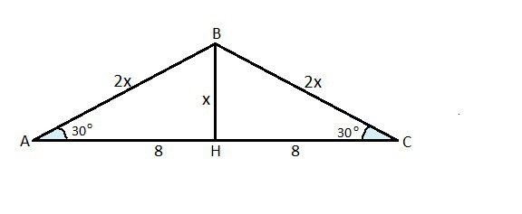 найдите боковую сторону равнобедренного треугольника если основание равна 16, а угол при основании равен 30 градусам