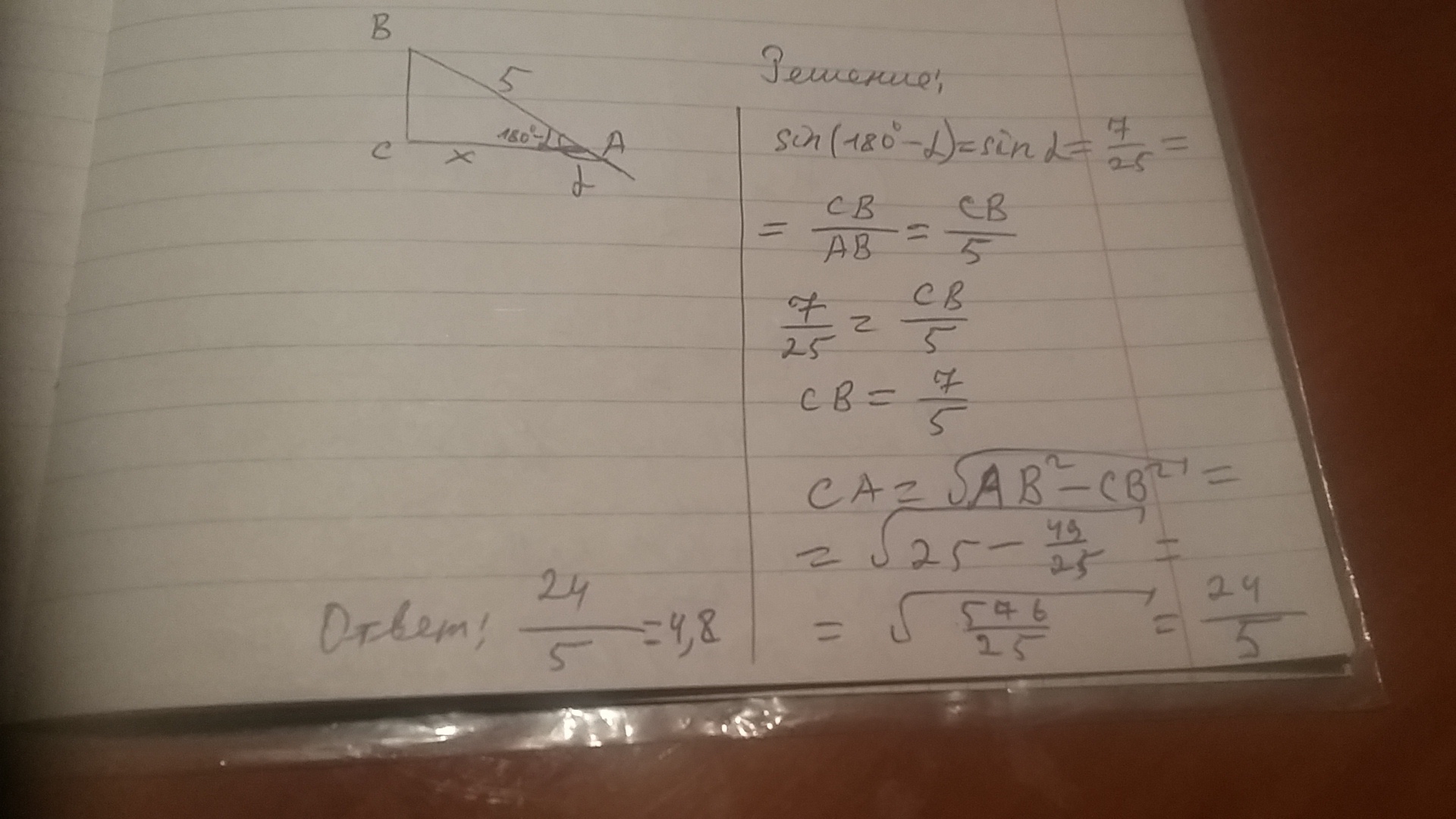 в треугольнике ABC угол С равен 90 градусов,синус внешнего угла при вершине А равен 7/25 АВ=5 Найдите АС