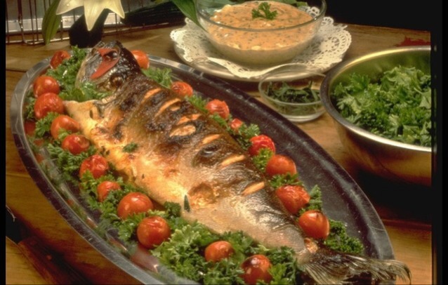 Рыбу вымыть, обсушить бумажным полотенцем. Изнутри посолить, поперчить и смазать пряным сливочным маслом. Рыбу выложить на хорошо смазанную растительным маслом решетку и обжаривать в течение 10 мин над углями, периодически переворачивая. Выложить на блюдо и по желанию украсить дольками лимона.