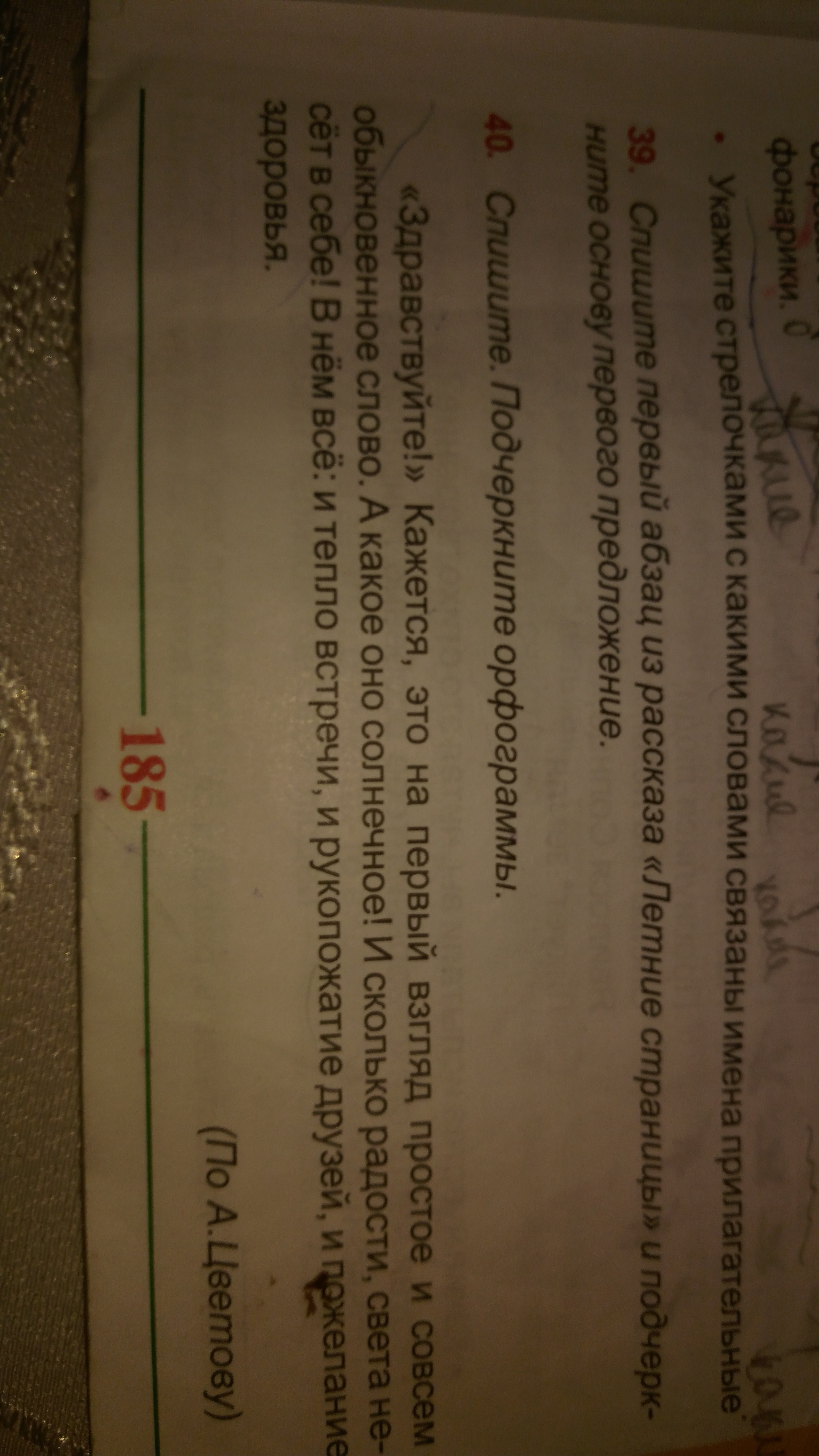 списал да? так орф щас скажу где подчеркнуть. Здравствуй подчеркни 1 букву в. ну слово взгляд подчеркни д в конце.обыкновенное подчеркни 2 нн в конце , пожелание подчеркни приставку по¬ вот так, простое подчеркни о 1, кажется подчеркни тс, оно подчеркни 1 о, тепло 1 е, здоровья 1 о подчеркни, несёт е подчеркни, солнечное подчеркни л, ну рукопожатие 1 о подчеркни это союз между словами связывает 2 корня