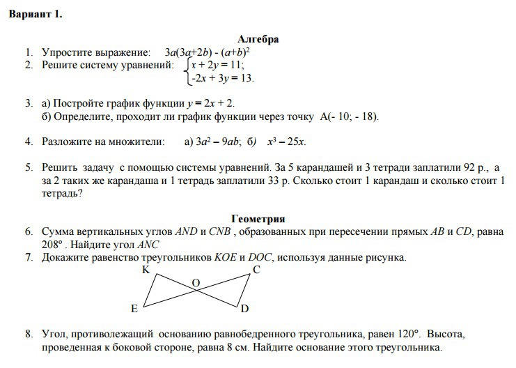 7. (Не знаю КО=ОD и ОЕ=ОС, но без этих данных задачу не решить, поэтому считаю что это показано на рисунке) Углы KOE и COD равны, т.к. они вертикальные. КО=OD ; CO=OE и Углы KOE и COD равныд, значит эти треугольники равны по двум сторонам и углу между ними