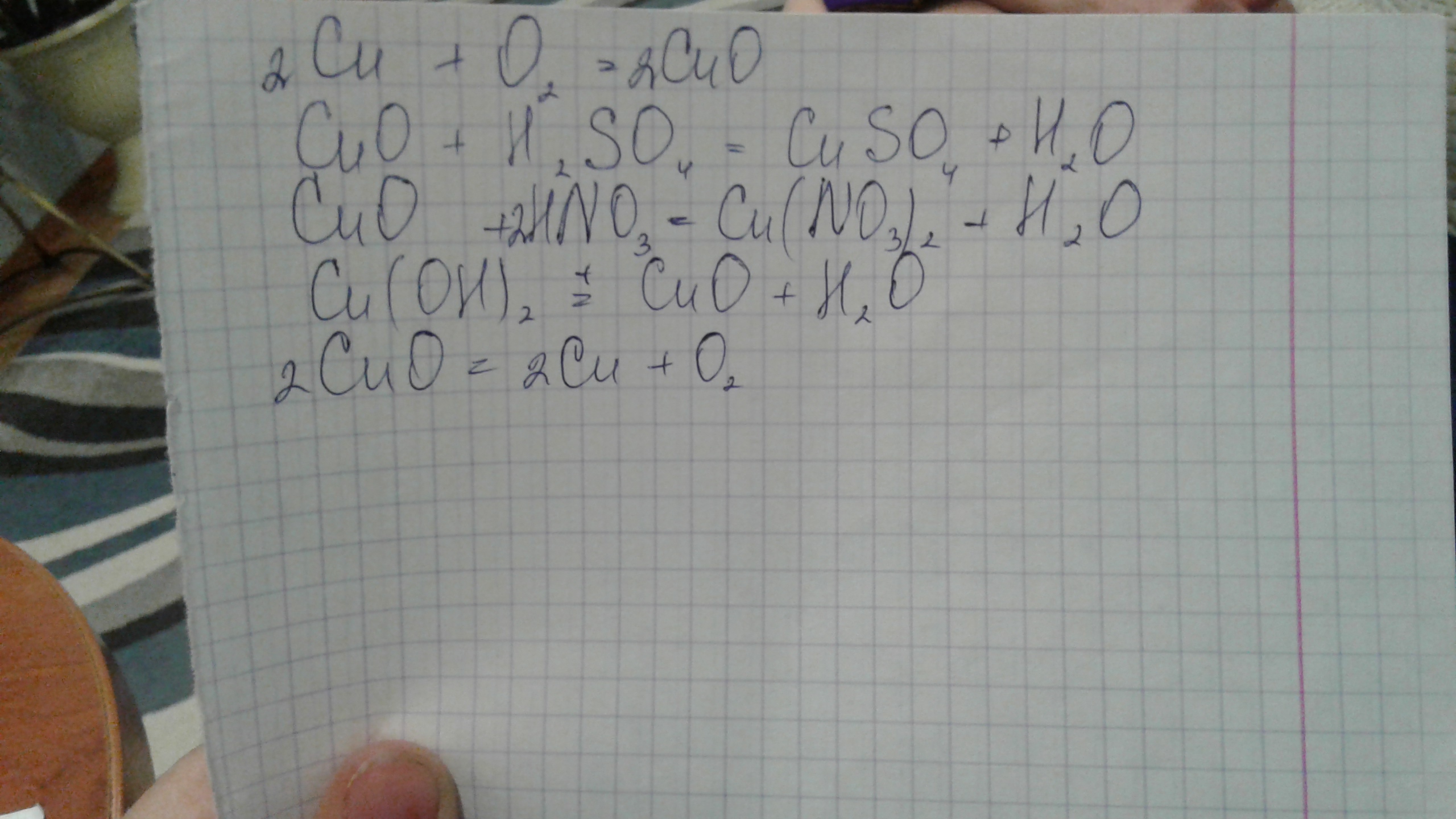 Осуществите цепочку превращений: медь —> оксид меди —> сульфат меди —> нитрат меди —> гидроксид меди —> оксид меди —> медь. Укажите тип каждой химической реакции и для реакций обмена составьте полное и скоращенное ионное уравнение. Очень надо! Спасибо!