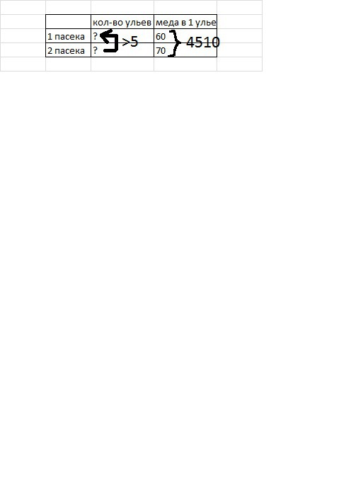 Ребят помогите .! На первой пасеке с каждого улья получили по 60 кг меда, на второй по 70 кг. всего собрали на двух пасеках 4510 кг. сколько ульев на каждой пасеке, если на