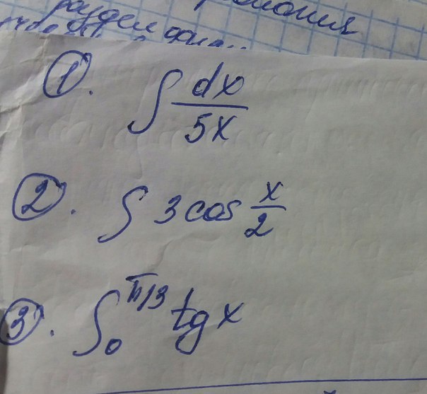 int  frac{dx}{5x} = frac{1}{5} cdot ln|X|+C\\int 3cos frac{x}{2}, dx=3cdot 2sinfrac{x}{2}+C\\  intlimits^{frac{pi}{3}}_0 {tgx} , dx = intlimits^{frac{pi}{3}}_0 {frac{sinx}{cosx}} , dx = intlimits^{frac{pi}{3}}_0 {frac{-d(cosx)}{cosx}} =-ln|cosx|, |_0^{frac{pi}{3}}=\\=-(ln|tgfrac{pi}{3}|-ln|tg0|)=-lnsqrt3=-frac{1}{2}ln3\\P.S.quad int cos(kx+b)dx=frac{1}{k}sin(kx+b)+C