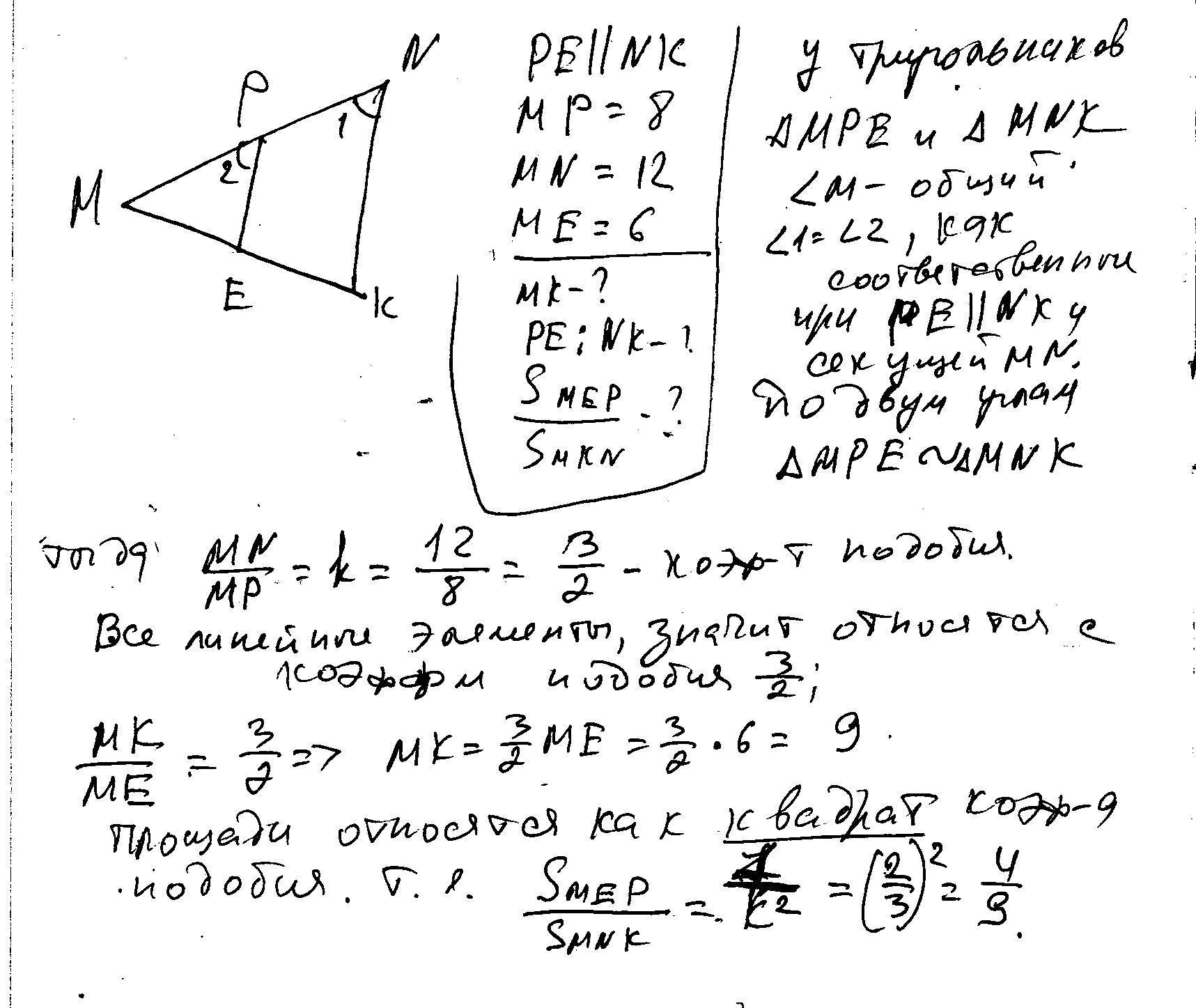 Дано: РЕ || NK, MP = 8, MN= 12, ME = 6. (рисунок)