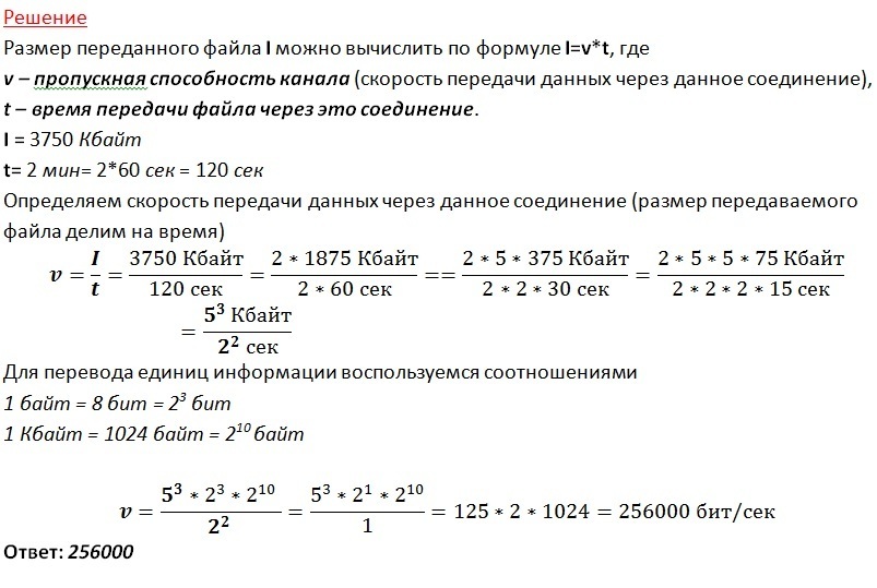 Передача файла размером 3750 Кбайт через некоторое соединение заняла 2 минуты. Какова скорость передачи данных через это соединение в битах в секунду?Ответ укажите одно число