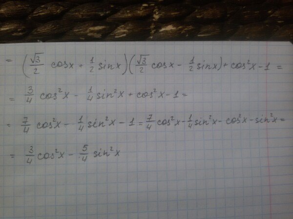 3/4 cos²x-1/4 sin²x+cos²x-1=7/4 cos²x-1/4 sin²x -1=1/4 (7cos²x-sin²x-4)=1/4 (7cos²x-sin²x-4cos²x-4sin²x)=1/4 (3cos²x-5sin²x)=1/4(3cos2x-2sin²x)=3/4 cos2x-1/2 sin²x