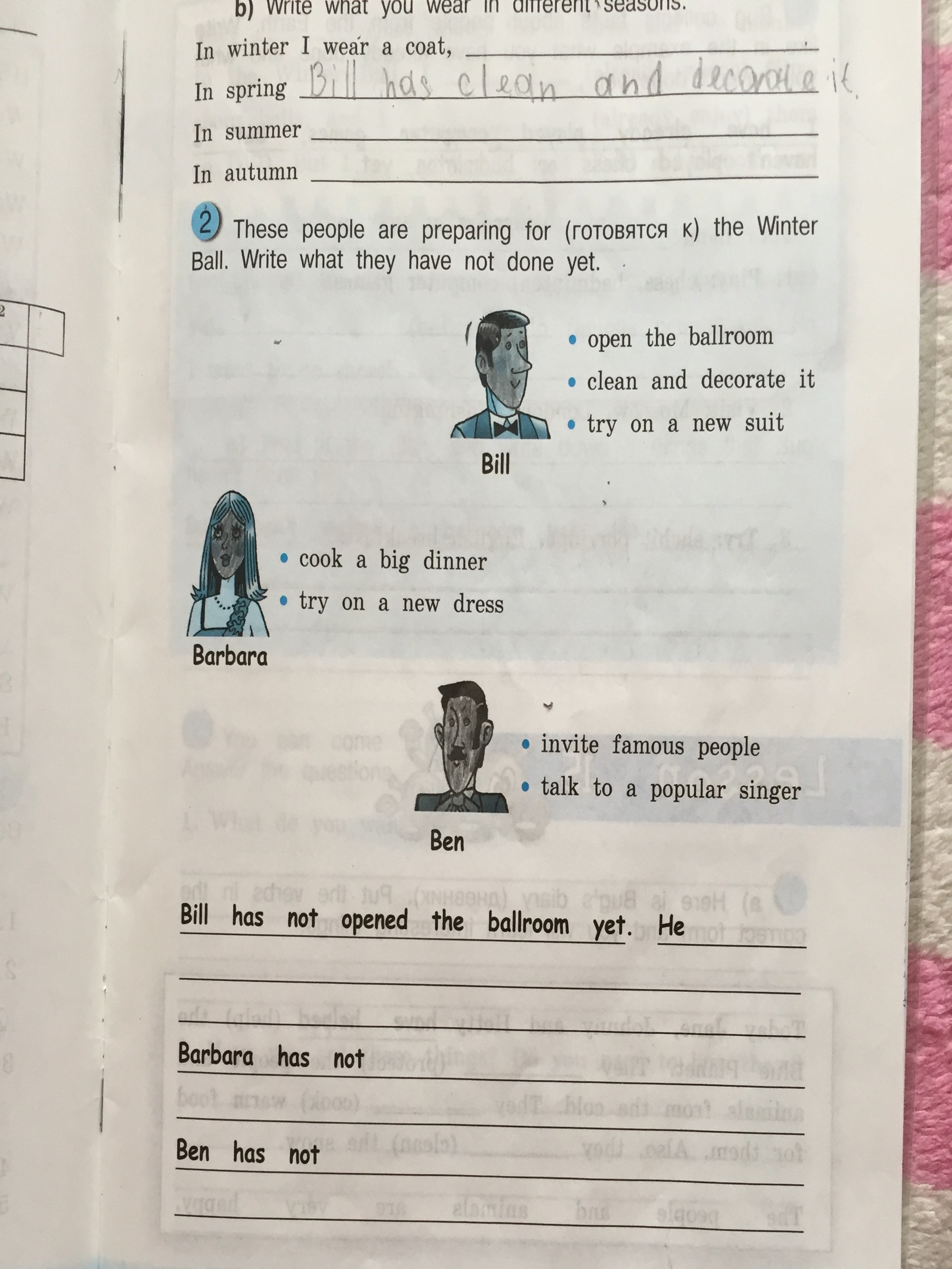 1) He hasn't clean and decorate it yet. He hasn't try on a new suit yet. 2) Barbara hasn't cook a big dinner. She hasn't try on a new suit yet. 3) Ben hasn't invite famous people. He hasn't a popular singer.