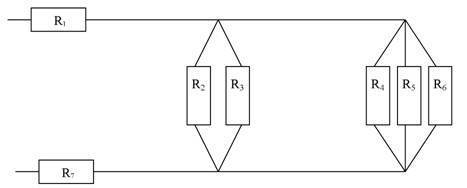 Найдите эквивалентное сопротивление, если R1 = 3 Ом; R2 = R3 = 20 Ом; R4 = R5 = R6 = 30 Ом; R7 = 3 Ом.