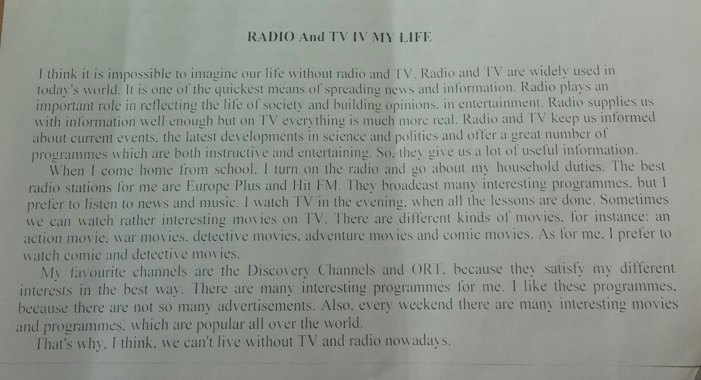Когда я прихожу домой из школы. Я включаю радио и заниматься своими домашними обязанностями. Лучшие радиостанции для меня Европа Плюс и Хит FM. Они транслируют главные интересные программы, но я предпочитаю слушать новости и музыку. Я смотрю телевизор вечером, когда все уроки сделаны. Иногда мы можем наблюдать довольно интересные фильмы по телевизору. Есть разные фильмы, например: боевик, военные фильмы, детективные фильмы, приключенческие фильмы и комические фильмы. Как по мне. Я предпочитаю смотреть комиксов и детективов.