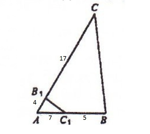 На сторонах АС и АВ треугольника АВС отмечены соответственно точки В1 и С1. Известно, что АВ1 = 4 см, В1С = 17 см, АС1 = 7 см, С1В = 5см. Докажите, что треугольники АВС и АВ1С1 подобны.