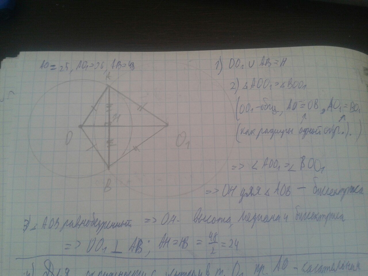 Отрезок АВ длиной 48 является общей хордой двух окружностей с радиусами 25 и 26. Найдите расстояние между центрами окружностей