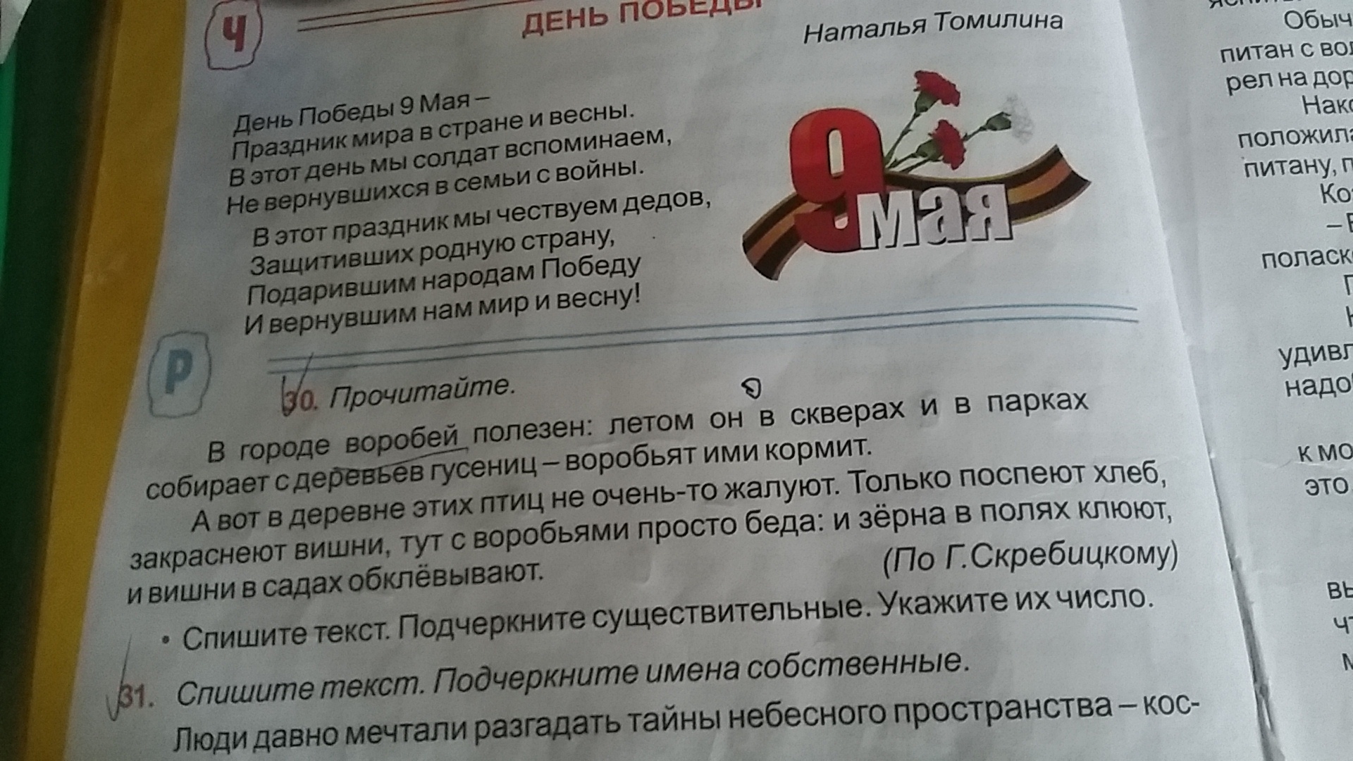 воробей-ед.ч, городе-ед.ч, летом-ед.ч, скверах-мн.ч, парках-мн.ч, деревьев-мн.ч, гусениц-мн.ч, воробьят-мн.ч, деревне-ед.ч, птиц-мн.ч,хлеб-ед.ч, вишни-мн..ч, воробьями-мн.ч, беда-ед.ч, зёрна-мн.ч, полях-мн.ч, вишни-мн.ч, садах-мн.ч
