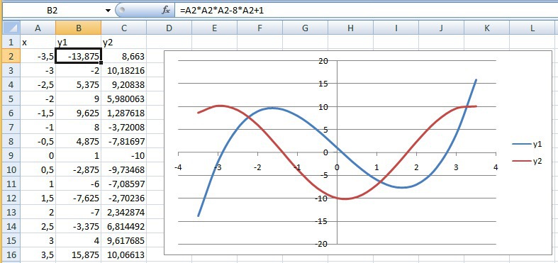 В прилагаемом файле показано решение уравнения с помощью диаграммы. Точки пересечения графиков - это и есть искомые значения x. Формулы: в столбце B: =A2*A2*A2-8*A2+1; в столбце C: =-2*SIN(A2)-10*COS(A2)