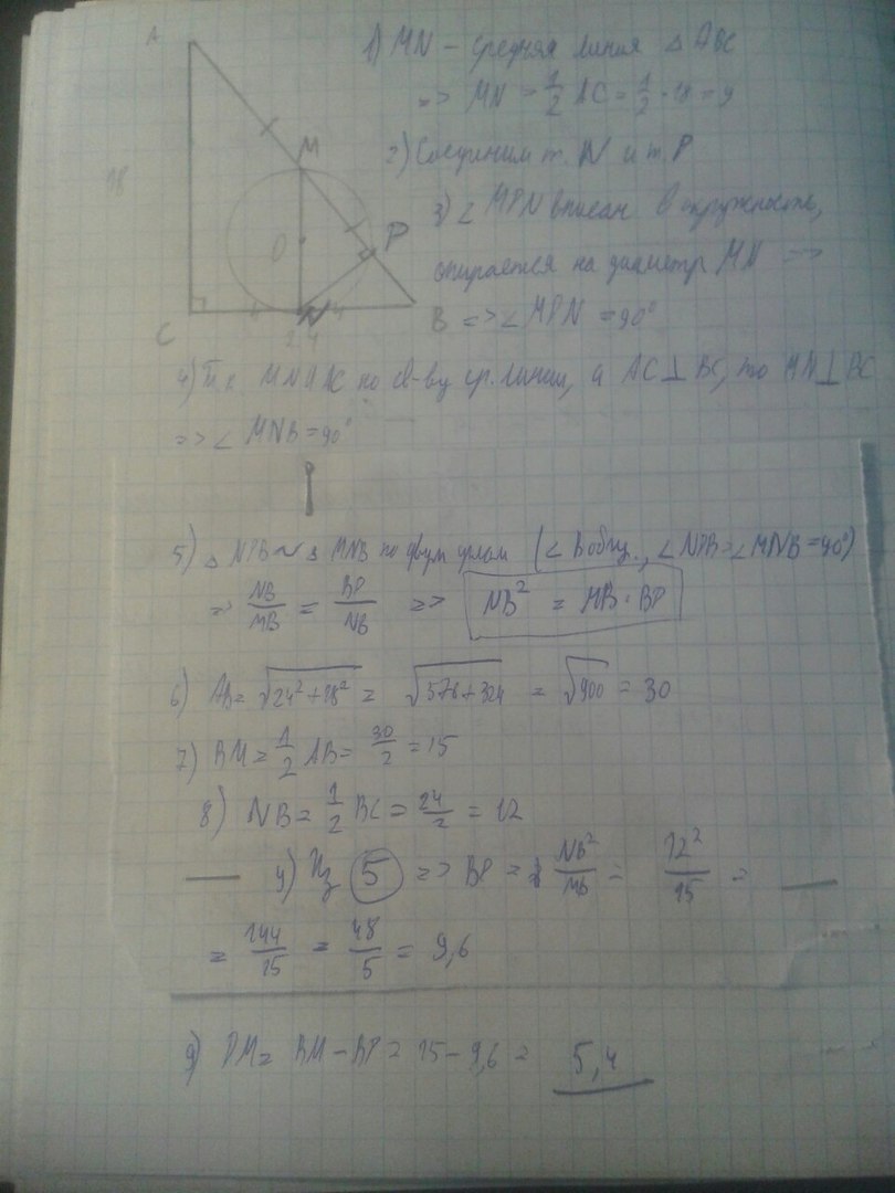 в прямоугольном треугольнике abc с катетами ac=18 и cb=24 провели отрезок, соединяющий середины сторон AB и BC. На этом отрезке, как на диаметре, построена окружность. Найдите длину отрезка гипотенузы AB, который лежит внутри этой окружности.