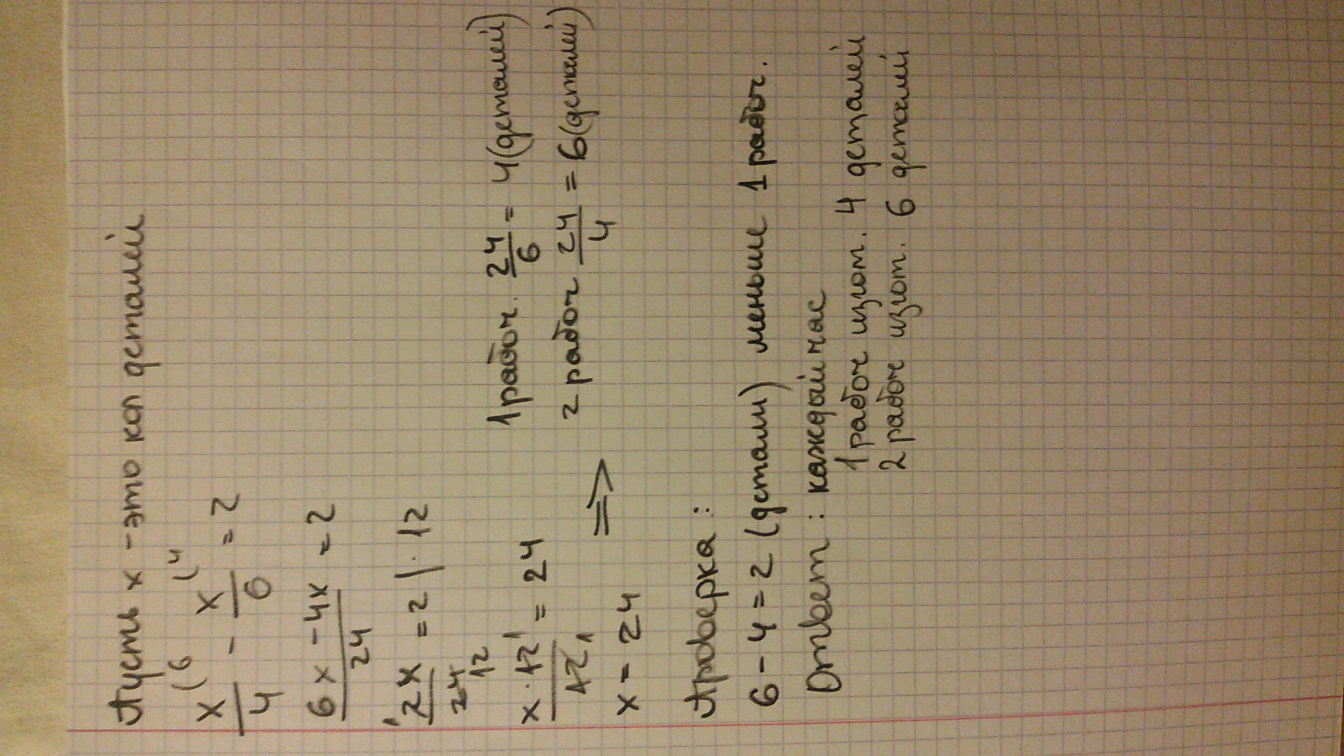 за 6 часов один рабочий изготовил столько же деталей, сколько другой - за 4 ч. Сколько изготавливает в час каждый рабочий, если первый изготавливает в час на 2 детали меньше, чем второй?