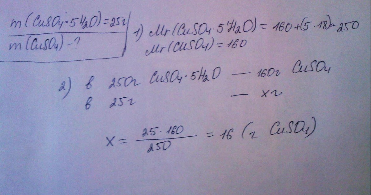 вычисли массу безводной соли CuSO4, которую можно получить из кристаллогидрата CuSO4* 5H2O массой 25 г.