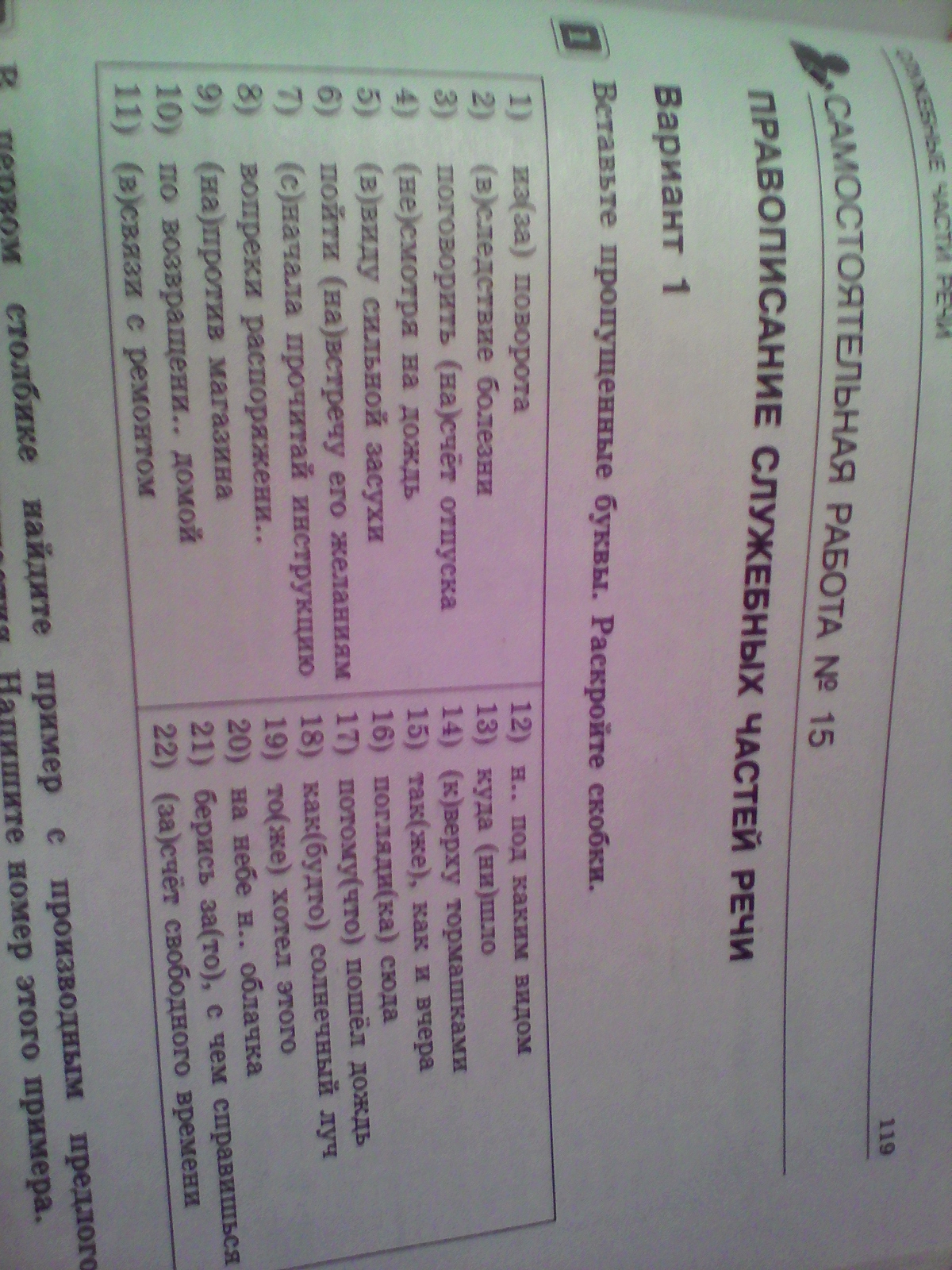 1) из-за поворота; 2) вследствие болезни; 3) поговорить насчет отпуска; 4) несмотря на дождь; 5) ввиду сильной засухи; 6) пойти навстречу его желаниям; 7) сначала прочитай инструкцию; 8) вопреки распоряжению; 9) напротив магазина; 10) по возвращении домой (предлог ПО требует предложного падежа!); 11) в связи с ремонтом; 12) ни под каким видом; 13) куда ни шло; 14) кверху тормашками; 15) так же, как и вчера; 16) погляди-ка сюда; 17) потому что пошел дождь; 18) как будто солнечный луч; 19) тоже хотел этого; 20) на небе ни облачка; 21) берись за то, с чем справишься; 22) за счет свободного времени.