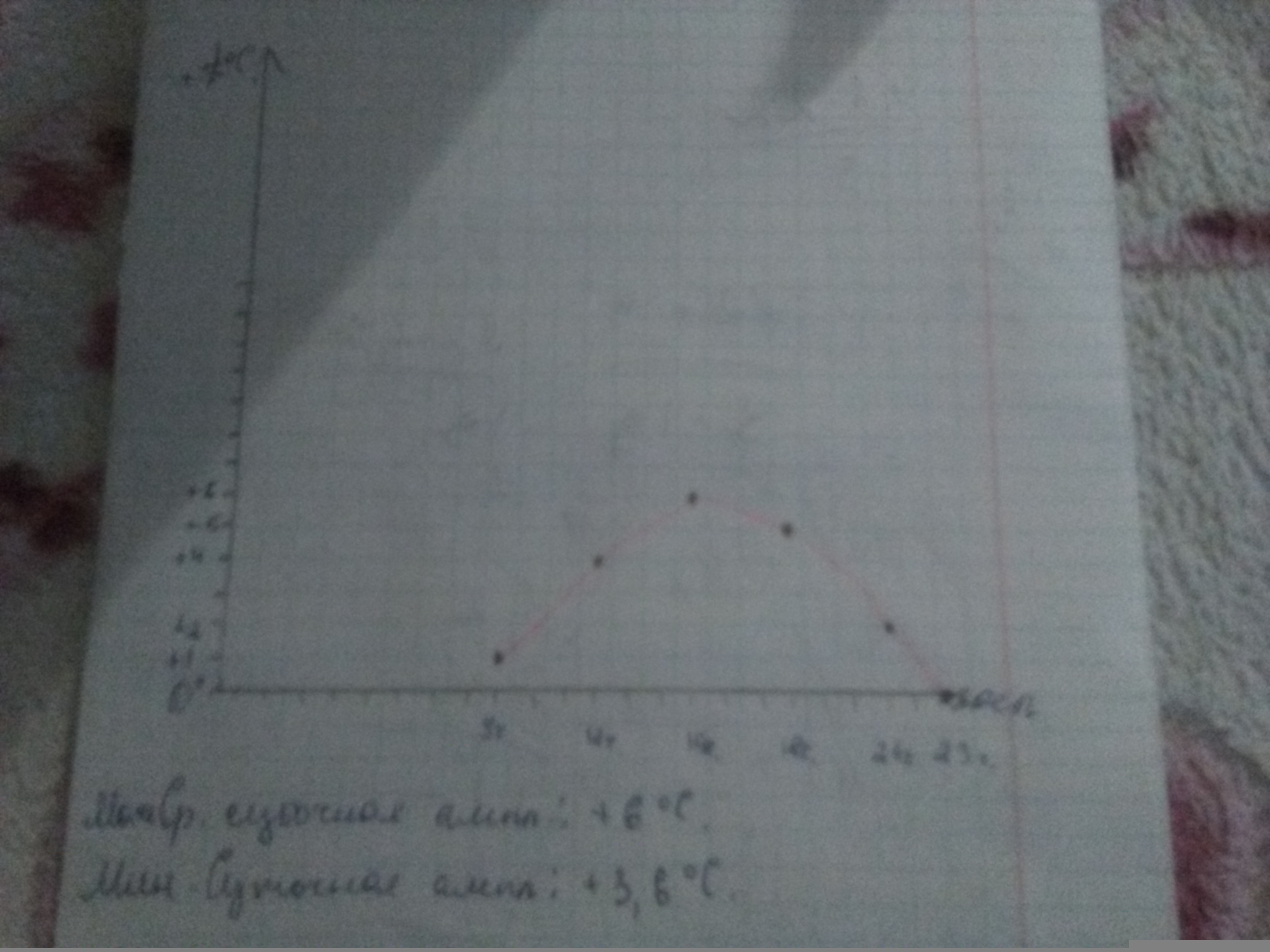 Построить график суточного хода температуры воздуха по данным таблицы (она будет снизу). Определить максимальную и минимальную температуры,суточную амплитуду.ТАБЛИЦА в6часов -5